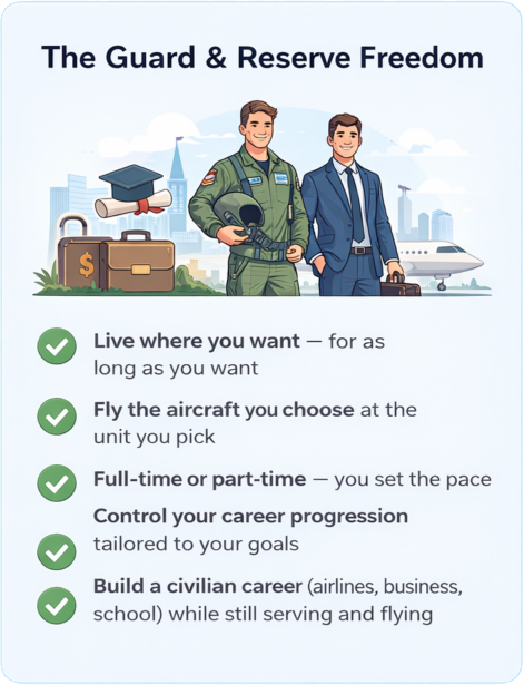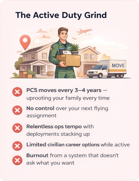 You know what you signed up for on active duty. But after years of deployments, PCS moves, and zero control over your next assignment, a lot of rated pilots start asking the same question: Is there a better way to keep flying?